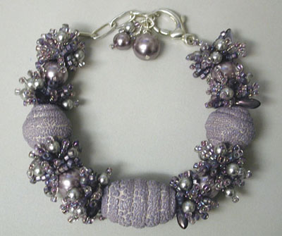 My new favorite bracelet. Purples and blues, inspired by a Stephanie Sersich bracelet I bought, but not made the same way as hers. Gotta love that wonky starfish button too - I made it!