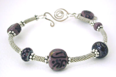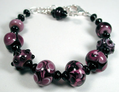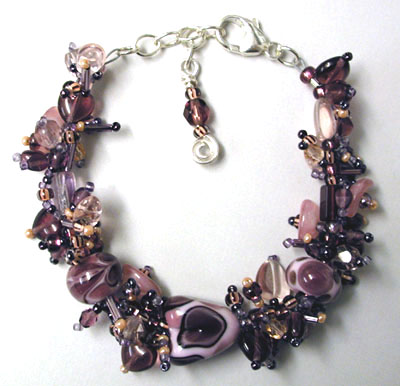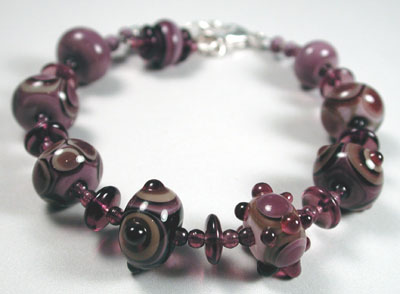 Eight of my handmade lampwork beads in layers of several shades of purple, mauve and violet with a subtle taupe make great swirls and patterns, and the purple bumpies sparkle like jewels. Strung with purple glass disks, this bracelet is earthy yet glamorous, and would look great with either khakis or that little black (or purple!) dress. Closed with a nice chunky sterling silver lobster claw and chain, it's adjustable from 7 inches to 8 1/2 inches.