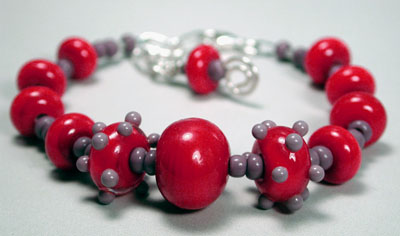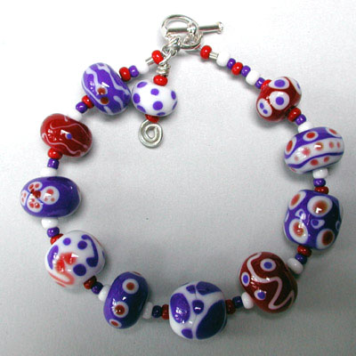 Red and Purple - Inspired by the poem, Warning, by Jenny Joseph, which starts out: When I am an old woman I shall wear purple - With a red hat which doesn't go and doesn't suit me, this bracelet has a fun and spunky personality all it's own. Handmade lampwork beads (not made by me this time) and sterling silver lobster claw clasp and chain. Adjustable from 7 inches to 8 1/2 inches. (Sold! - But I can make this or similar to order - $50.00 - just drop me a note.)