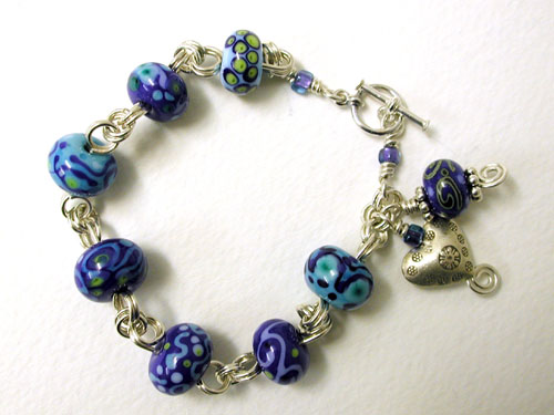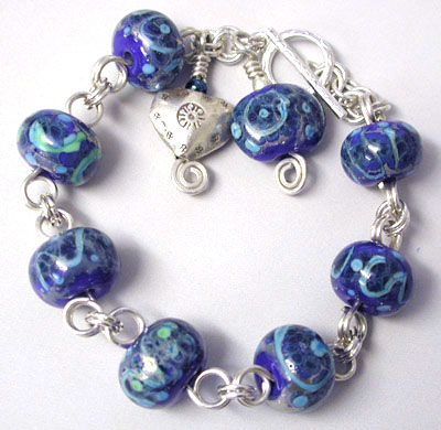 A "Blues" Bracelet - perfect with denim. Eight fun and funky handmade lampwork glass beads (mine) in blues, greens and purples. Sterling silver wire and toggle clasp, and a Hill Tribe silver heart dangle. 8.75 inches long - fits nicely on a 7 inch or so wrist.
