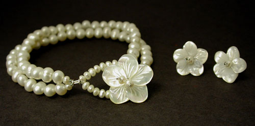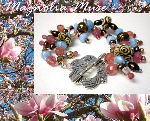 Magnolia Muse - Inspired by a photograph of a wonderful magnolia tree. This bracelet features a wonderful BIG Kate McKinnon clasp in sterling silver and two strands of glass, pearl and carved bone beads.