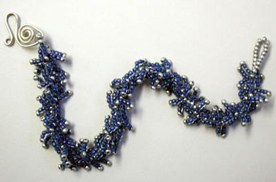 My "Snowflake" bracelet - spiral rope bracelet in denim blue seed beads, embellished with blue and silver bead spikes, closed with a handmade sterling silver swan clasp.
