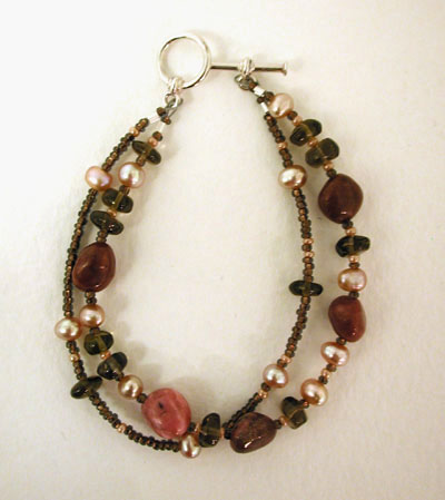 "Relaxation Bracelet" - This bracelet is earthy, yet sophisticated and feminine as well. The pink stones are rhodonite, which, if you are into what stones "do", promotes balance, love, attunement with spirituality and dispels stress. The clear brown stones are smokey quartz, which also relieves stress and promote relaxation. Pale peachy pink freshwater pearls, glass seed beads and a sterling silver clasp finish up this two strand bracelet. 7 inches. Check out the earrings section for a pair that goes perfectly with this bracelet.