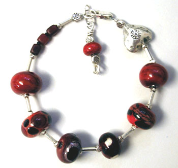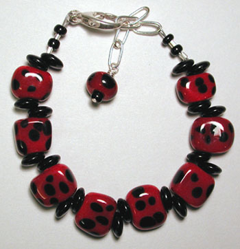 Ladybug-red with black spots! This bracelet is made up of nine of my handmade lampwork beads - eight of them squished flat into some-what square tabs which lay flat on your wrist to make for a very comfortable wear. Closed with a nice chunky sterling silver lobster claw and chain, it's adjustable from 7 inches to 8 1/2 inches.