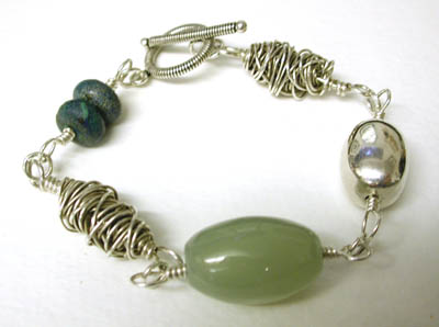 Calm Chaos - Something about this bracelet is so messy and chaotic, yet at the same time it is calming and soothing... the mess is obviously the two handmade sterling silver wire "nest" beads, and the greenish greyish stone is chalcedony and the ancient looking blue-green stones are chrysocolla. This bracelet is 9 inches long, but because the beads are bulky, it fits my 6.5 inch wrist just right. Closed with one of my favorite sterling toggles.