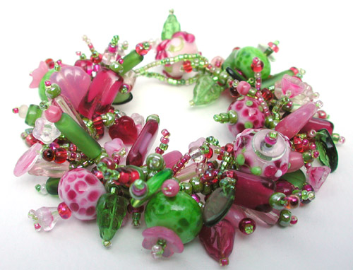 Lilly Pads - That's what I'll call it I thought the day we went canoeing out on Pine Lake. The pinks match perfectly the beautiful flowers sitting there sunning themselves on the water. There should be a frog, but you will have to use your imagination - perhaps prince charming is hiding in there somewhere... Eight of my handmade lampwork beads, hundreds of other accent and support crew beads. This big chunky bracelet fits my 6 1/2 inch wrist perfectly - if yours is the same size or a little smaller it will fit you too - sorry I can't resize, but I am trying to make more... and trying to figure out how to get the same look in an adjustable bracelet.