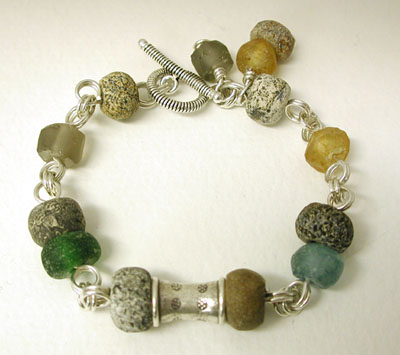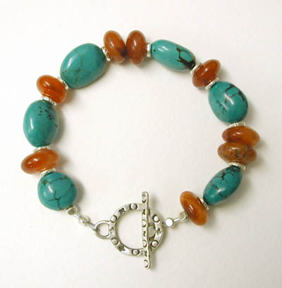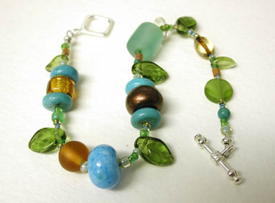 Early Bird II - Another spring bracelet in turquoise blues, greens, golds and coppery browns. One of my handmade lampwork beads mixed with turquoise, glass, resin, ceramic... closed with a sterling silver toggle. 8 inches. $45 (sold!)