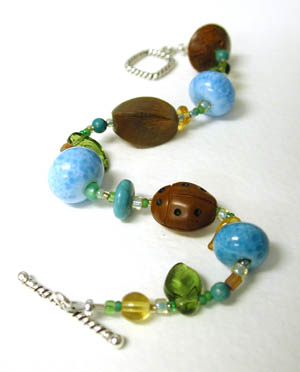 Early Bird I - What says spring more than a Robin Redbreast? The eggs in her nest of course. Three of my handmade lampwork beads mixed with an eclectic collection of glass, turquoise, a horn ladybug, and a nut bead. Closed with a sterling silver toggle clasp. 8 inches.