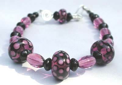 Purple Polka Dots - Four of my own handmade lampwork beads in purple with little polka dots - three acting as focals and one ity-bitty-teeny-tiny one as part of the dangle on the clasp - strung with purple and black glass beads to make very sweet little bracelet. Closed with a sterling silver trigger clasp and chain, it's adjustable from 7 inches to 8 inches.