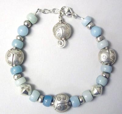 Lucky Lady Bugs - Three Hill Tribe sterling silver lady bugs surrounded by soothing amazonite and more silver. Closed with a sterling silver claw clasp and chain with anotehr ladybug for a dangle. Adjustable from 7 3/4 to 8 1/2 inches.