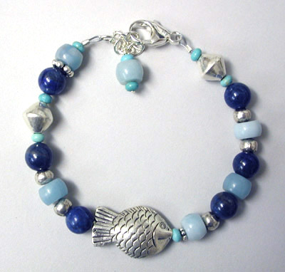 Swimming in the Deep Blue Sea Bracelet - featuring a nice Hill Tribe sterling silver fish bead, amazonite, turquoise and lapis beads and a bunch more sterling silver... Closed with a big chunky sterling silver claw clasp and chain. Adjustable from 7 1/4 to 8 1/4 inches.