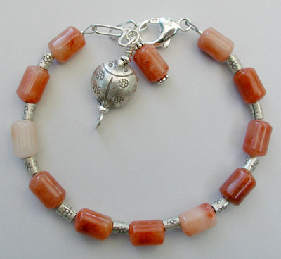 A simple bracelet loaded with Carnelian and Karen Hill Tribe Silver. Carnelian is known for its healing and calming properties. I think it feels very zen and soothing. Closed with a big chunky sterling silver claw clasp and chain with a Hill Tribe Lady Bug dangle for good luck. Adjustable from 7 1/2 to almost 9 inches.