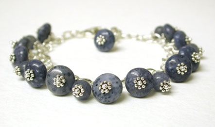 True Blue - The perfect bracelet to wear every day with or without your jeans. Blue coral from Thailand, sky blue quartz and Bali sterling silver. Charms are wrapped on to the sterling silver chain using handmade fine silver headpins. Adjustable from 7 to 8 1/2 inches.