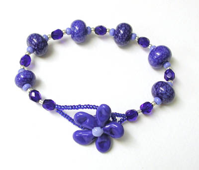 My new favorite bracelet. Purples and blues, inspired by a Stephanie Sersich bracelet I bought, but not made the same way as hers. Gotta love that wonky starfish button too - I made it!