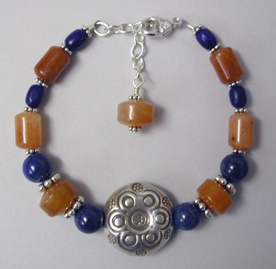 Here is a bracelet that will go with your cowboy boots... or maybe that peasant skirt... and definitely the suede jacket! Focal bead is Hill Tribe sterling silver, and it's surrounded by carnelian, lapis and more silver. Closed with a sterling silver claw clasp and chain. Adjustable from 7 to 8 inches.