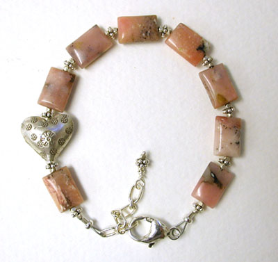 Love Dreaming - Pink opals are said to amplify and mirror feelings, buried emotions, desires (including love and passion), lessen inhibition, increase spontaneity, helps with visualization, imagination, dreams, healing. Paired up with a Thai Silver heart and bali spacer beads. Adjustable from just a little over 7 inches to almost 8 1/2 inches. $50.00 (Sold!)