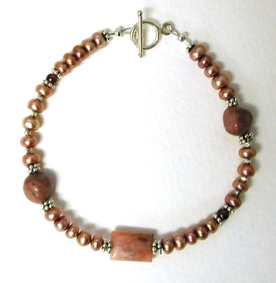 Blush - Pink Peruvian opal, rhodonite, garnets, fresh water pearls and lots of sterling silver. Closed with a sterling toggle clasp. 8 inches. $50.00 (Sold!)
