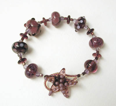 Purple Sea Star - One of my handmade starfish beads is the clasp for this fun purple glass bracelet. Features 7 more of my lampwork beads. 8 inches long.