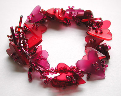 Slew of Hearts Bracelet - Acrylic buttons in shades of red and burgundy mixed with a bead soup of seed beads. Bracelet is 7 1/2 inches long. Closed with a button toggle closure. $60.00 (Sold!)
