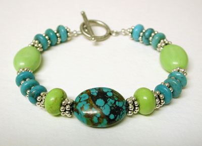 Lime Energy - A really wonderful chunk of turquoise mixed with bright and light lime green gaspeite and tons more turquoise rondels and Bali sterling spacers. Closed with a sterling toggle clasp. 8 1/2 inches.