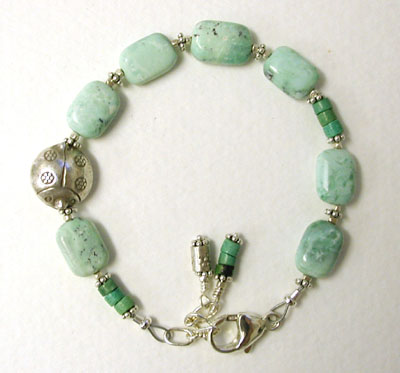 Eternal Spring - This bracelet is composed of calming, meditative varisite from Australia, green turquoise and a lone Thai Silver Ladybug. Closed with a sterling silver chain and clasp. Adjustable from 7 inches to 8 inches. $50.00 (Sold!)