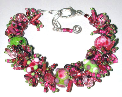 Raspberries and apples! The colors in this garden style bracelet are so flattering to most skin tones and will go so well with this spring and summer's fashions. Five of my own handmade lampwork beads in pinks, greens and purple, surrounded by fringes of seed and glass beads in pinks and greens. Closed with a nice chunky sterling silver trigger clasp and chain, it's adjustable from 7 inches to 8 1/2 inches.