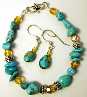 Southwest Winds - Turquoise and amber colored crystals combine with Bali sterling silver accent beads to make up this pretty bracelet. Closed with a sterling "S" clasp. Earrings to match.