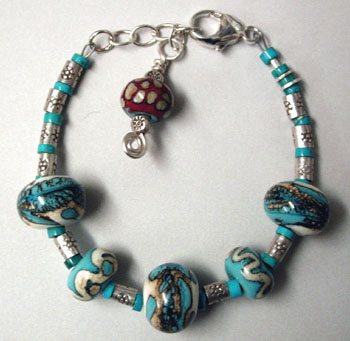 This bracelet reminds me of the Southwest. Handmade lampwork beads in turquoise and ivory, with organic feathery black highlights, strung with Karen Hill Tribe sterling silver beads and little disks of turquoise. Bracelet is closed with a nice chunky sterling silver lobster claw clasp and a dangle made from more Hill Tribe silver and a lampwork bead in brick, ivory and turquoise. Adjustable from 6 1/2 inches to 7 1/2 inches.