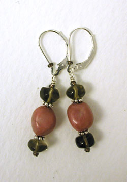 Relaxation Earrings - The pink stones are rhodonite, which, if you are into what stones "do", promotes balance, love, attunement with spirituality and dispels stress. The clear brown stones are smokey quartz, which also relieves stress and promote relaxation. Hung on sterling silver leverback wires with Bali silver spacers.