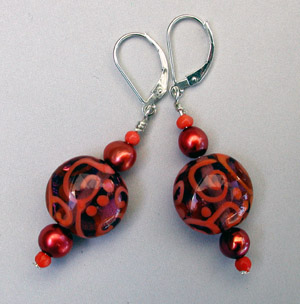 Wonderful lentil beads by lampwork artist Kaye Husko, paired with shimery coral colored pearls and tiny vintage coral beads. Sterling silver wires.