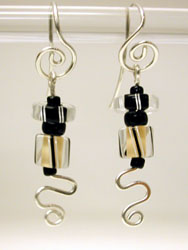 These fun earrings are handmade from sterling silver wire and feature handblown furnace glass in black, white and beige.