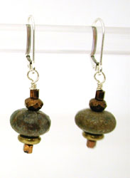 Earthy chrysocolla and fire polished bronze glass beads. Sterling silver French ear wires.
